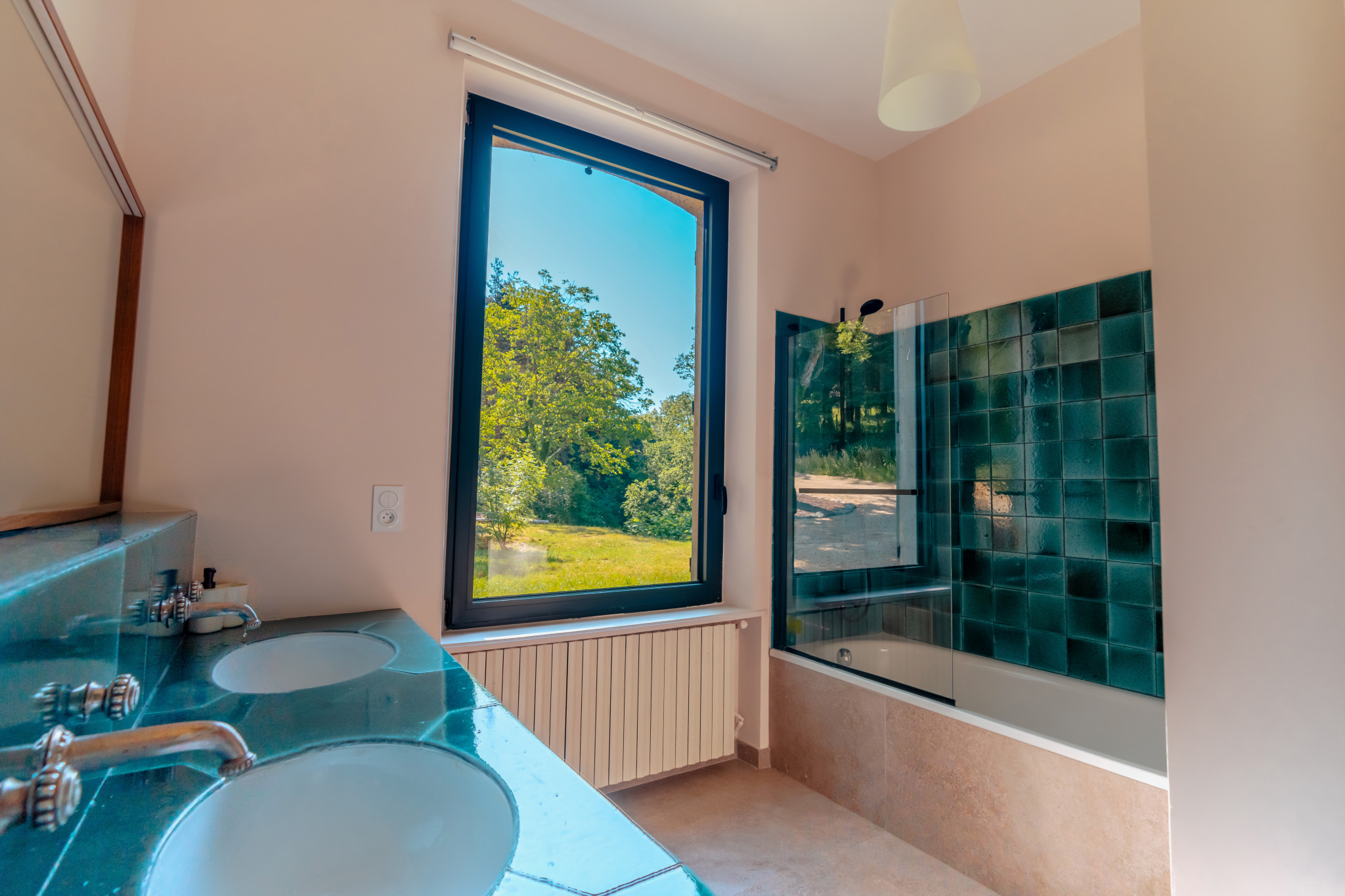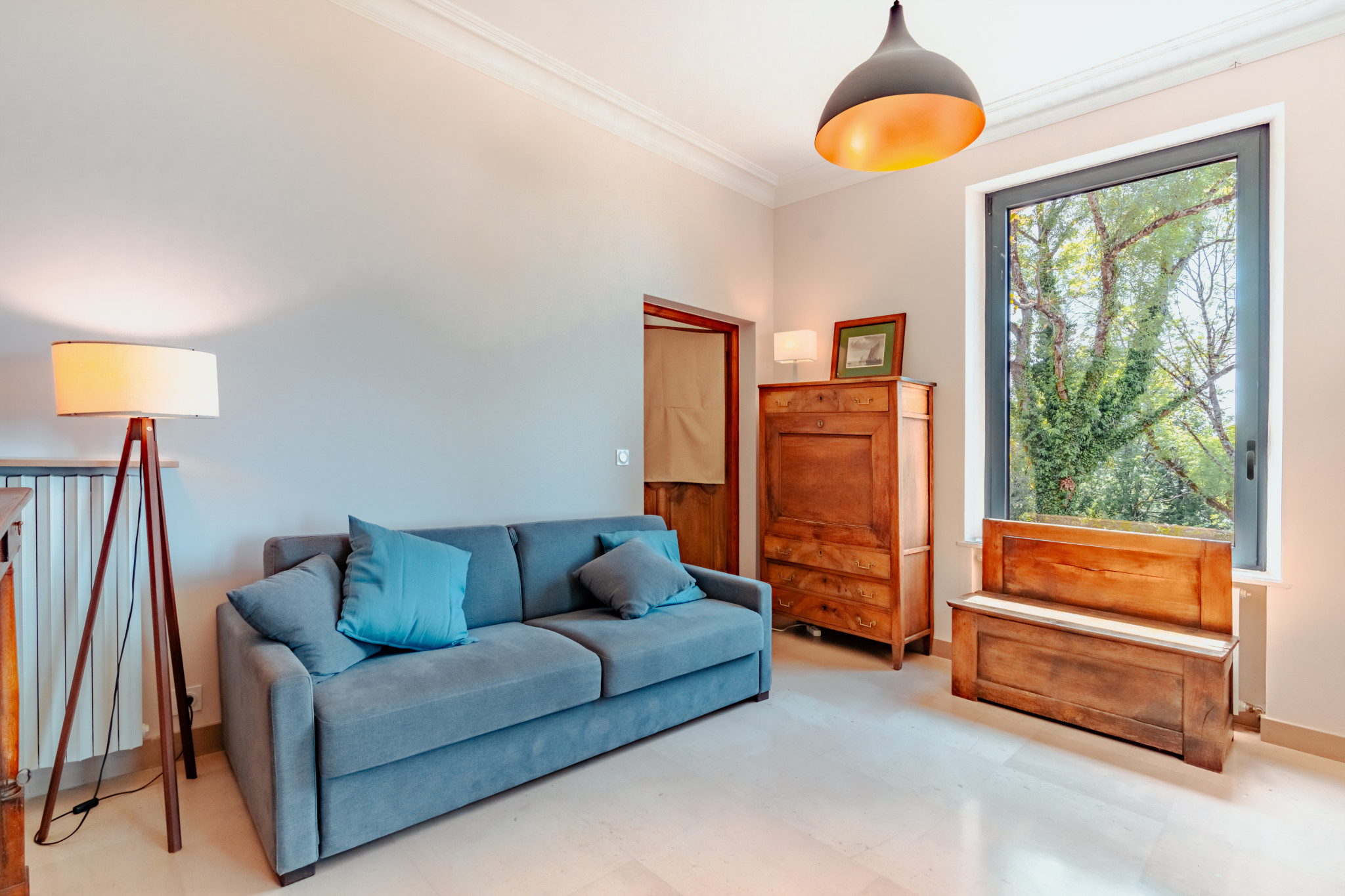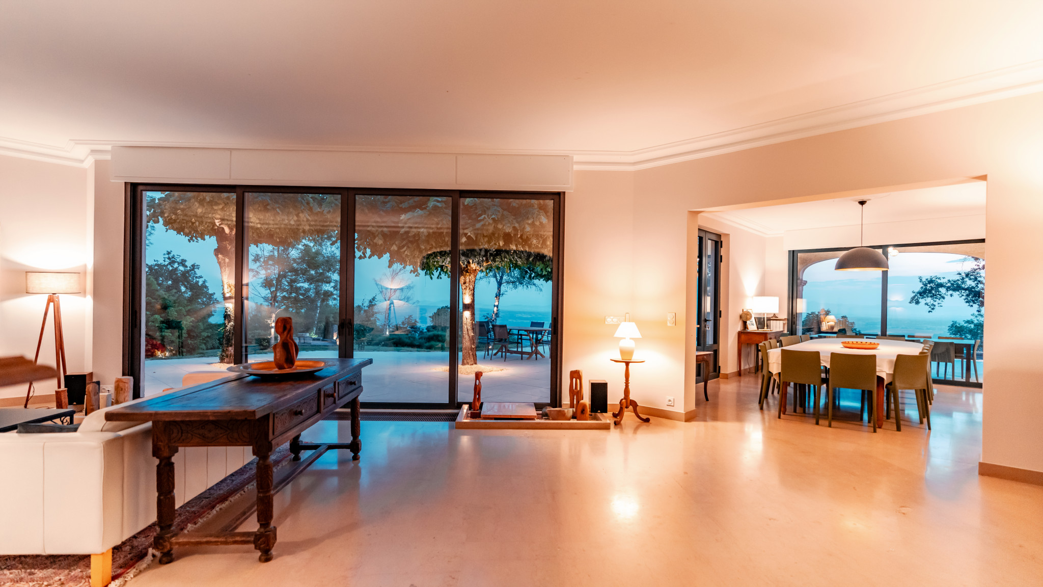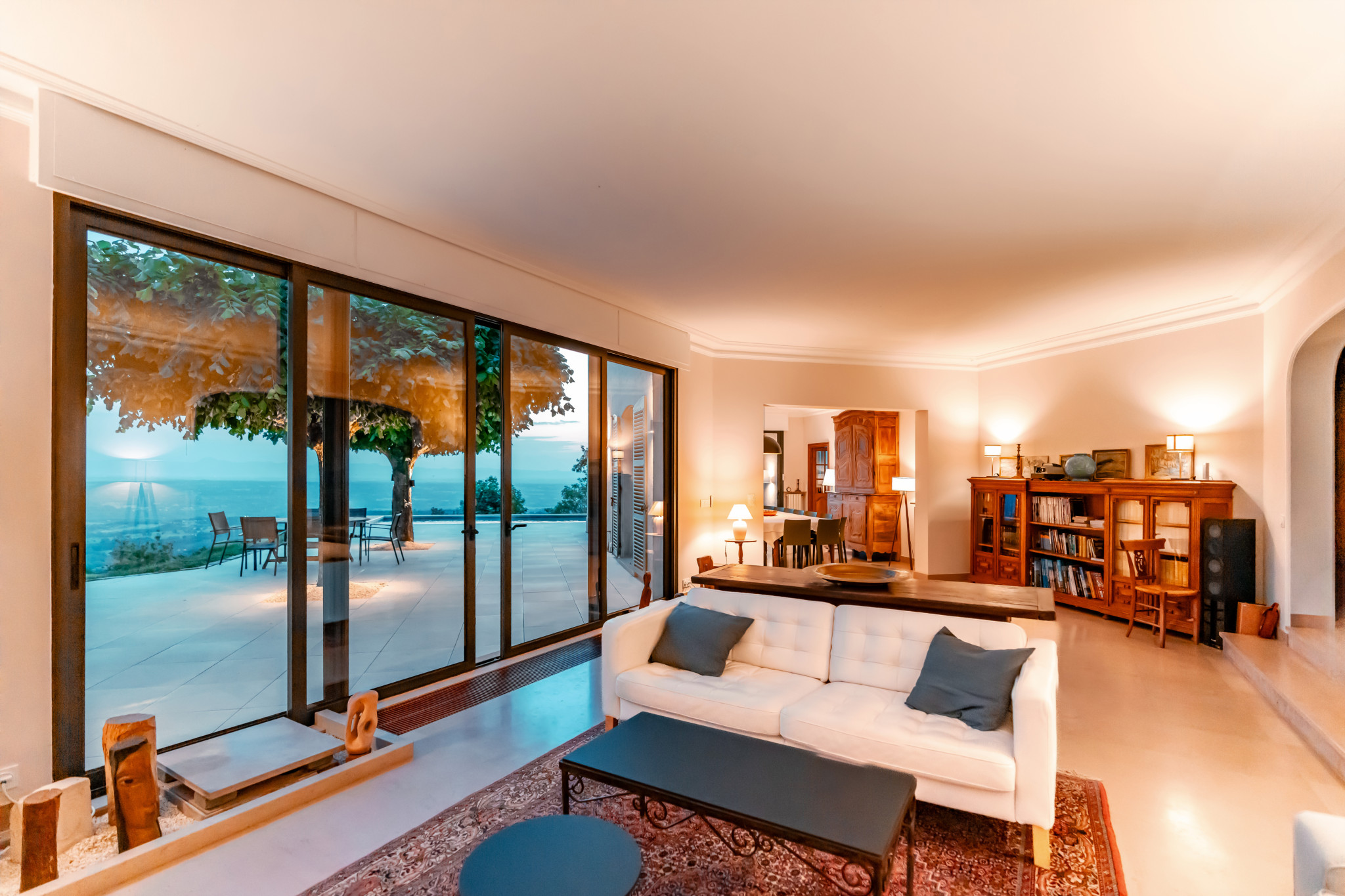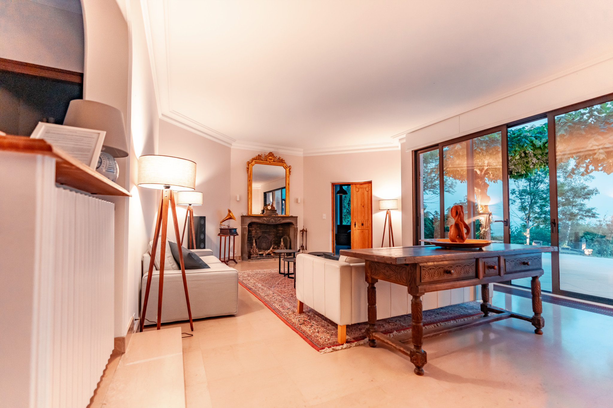 Grand séjour de 50m² avec cheminée, home cinéma et baies vitrées ouvrant sur la terrasse.